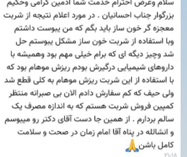 🔶ببینید ،شربت خونساز و سرکنگبین به خاطر ترکیب عسل و سرکه ..باعث درمان انواع سرطان و رفع غلظت خون و بیماری های کبد و گرفتگی عروق قلب و تقویتش میشه. 🔶رمز درمان سرطان اینه : ترش طبیعی (سرکه انگور خمری )+ شیرین طبیعی (عسل يا شیره انگور يا ترنجبین ) که باهم مخلوط بشه .دو واحد ترش و یک واحد شیرین ، همون اثرات درمانی که بالا گفتم رو به راحتی ایجاد میکنه 🔶یعنی شما میتونید به راحتی با همین سرکنگبین يا شربت خون ساز پژوهشکده و رعایت تدابیر ،یک بیمار سرطانی رو تا حد زیادی درمان کنید .توده کاملا آب میشه توی ترکیبات شربت خونساز رب انار هم هست قبلا توضیح دادم، شیره ای که از میوه ی درختانی گرفته شده باشه که کود یا سم خورده باشن یا با اب سد ابیاری شده باشن یا طبق اصول درست نشده باشه هیچ خاصیت خونسازی نخواهد داشت... و باعث بالا رفتن صفرا و در نهایت کم خونی هم میشه...✋🏼 انار هم همینطور،اگه پای درخت سم یا کود استفاده شده باشه،به انار سم زده باشن،بدتر باعث بالا رفتن غلظت خون میشه...✋🏼 اناری که ربش رو گرفتیم و توی تهیه ی شربت استفاده کردیم